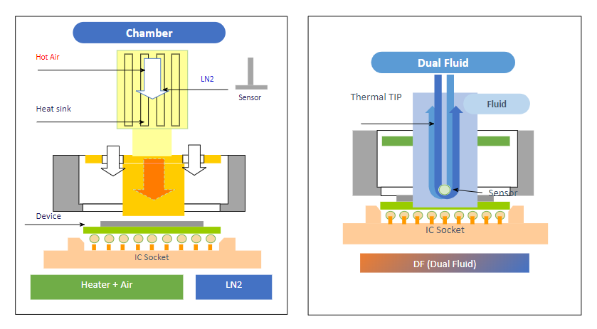 Figure 3. A conventional temperature-test method based on a chamber requires a long time to apply the appropriate temperature and offers limited accuracy (left). An alternative dual-fluid temperature application method enables temperature to be switched in a short time, and temperature accuracy is ±1°C (right).