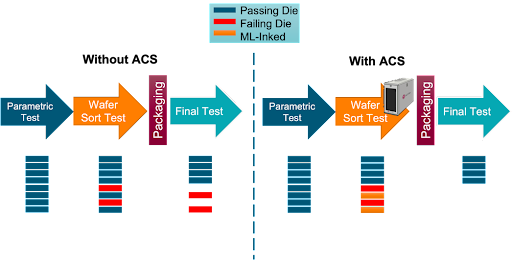 The earlier users seek to identify problems in the manufacturing process, the more data they require. Early bad-die detection is a vital component of this effort, as predicting likely failures post-packaging can help to significantly reduce costs and improve quality in the packaging process. To achieve this requires large amounts of high-quality data. Figure 2 shows the traditional test flow without benefit of ML techniques at left. At right, our ACS technology assesses data gathered from prior insertions and correlates it to accurately predict problems, enabling the user to circumvent them by fixing problems at the root cause, thus preventing bad die from reaching downstream test insertions. This reduces not just the cost of test but also the cost of the materials and processing needed as chips travel through the three-month long manufacturing process across continents and companies.