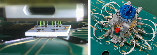 Figure 6 shows an example of a prototype reactive near-field socket3. Here, measurement of a dual-polarized 2×2 AiP array results in eight individual signals. To keep ATE resources to a minimum, a solid-state relay switches each of the antenna/polarization signals in series to the ATE measurement instrument. A parallel measurement approach is also possible but requires eight ATE measurement instruments. The optimal setup will depend on a detailed cost-of-test analysis.