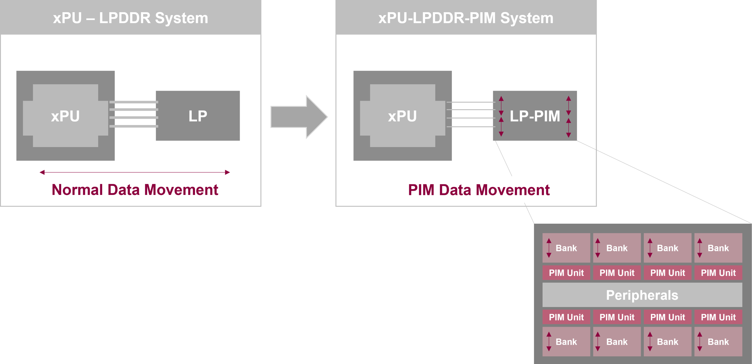 Another AI memory function advancement is processing-in-memory (PIM) technology. AI training and inference require significant computational or mathematical resources to operate a combination of matrix multiplications, vector operations, activation functions, or gradient calculations. Figure 4 illustrates the benefits of implementing PIM in conjunction with LPDDR.