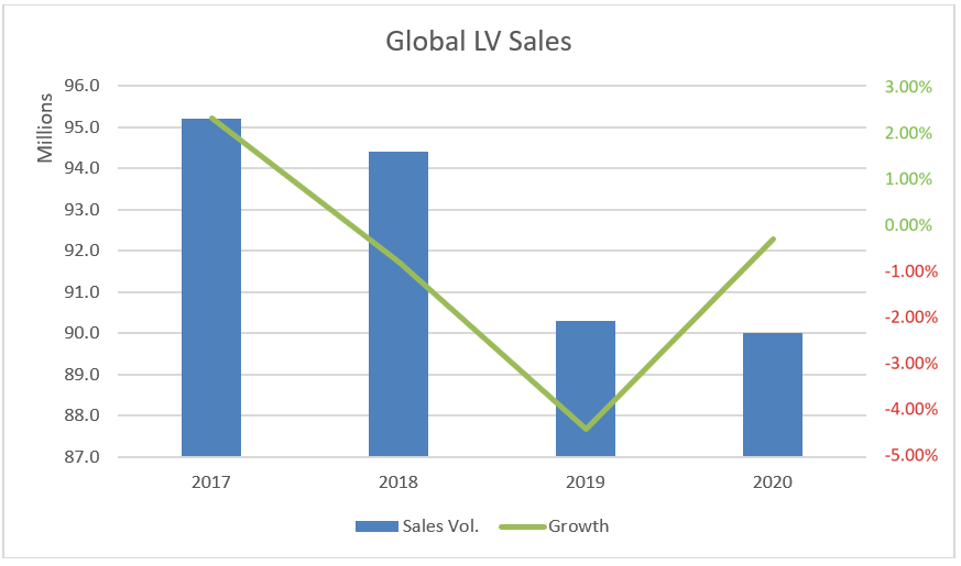 Figure 1. LMC Automotive forecasts a return to growth after a falloff from global peak light vehicle sales in 2017. (Source: LMC Automotive, https://lmc-auto.com/news-and-insights/peak-auto/)