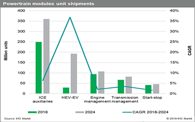 The research firm Omdia (formerly IHS Markit) forecasts significant growth for electric vehicles. The firm in 2019 predicted a CAGR greater than 35% for hybrid-electric and electric-vehicle powertrain module unit shipments from 2018 through 2024 (Figure 2).2