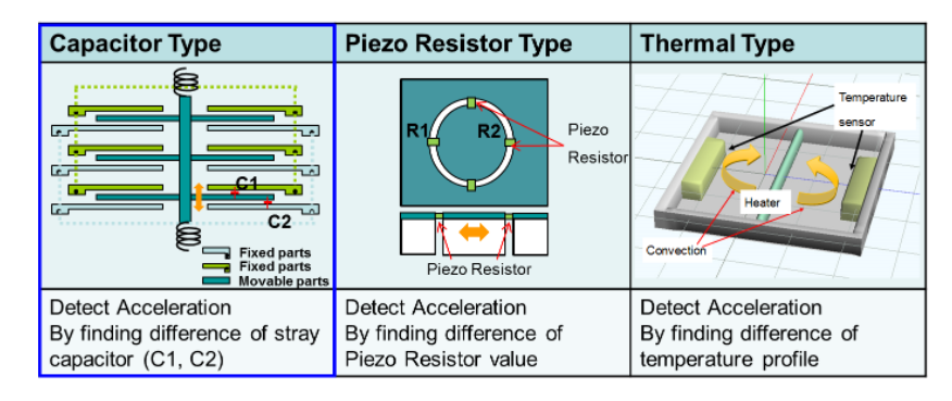 Figure 4. Accelerometers include capacitor types (left), piezo-resistor types (center), and thermal types (right).