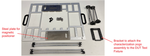 Advantest has developed a cost-effective solution to these challenges: our custom probing kit for V93000 DUT test fixtures that can be easily assembled and implemented as a desktop ATE test fixture. Figure 1a shows what the user receives in the kit, while Figure 1b shows additional parts needed and illustrates how the DUT board is positioned on the bracket. Figure 2 shows an example of a completed, installed assembly.