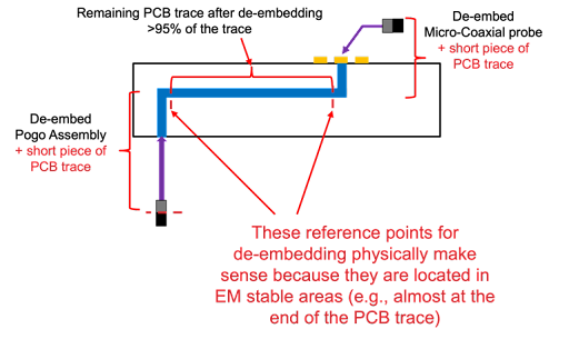 The IEEE 370-2020 standard incorporates parameters for measuring DUT performance, recognizing the critical importance of the test fixture in this capacity. This includes de-embedding, which the standard defines as “the process of removing fixture effects from the measured S-parameters [scattering parameters].” ATE test fixture de-embedding is not trivial; the measurement reference location is critical for de-embedding to be successful. The de-embedding reference point needs to be a location with stable electromagnetic (EM) fields. The de-embedding software will always de-embed whatever data is provided, but this doesn’t automatically mean that the de-embedding is physically correct.