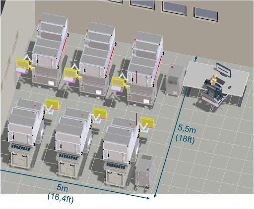 The handler features integrated active thermal control (ATC) over a -45 to +125°C range. ATC supports fast data collection and can improve temperature cycle testing throughput by 40% compared to manual thermal-control approaches. The handler also can include a camera to facilitate remote work and 24/7 availability. The total test-cell footprint measures 0.56 m by 0.82 m, allowing six test cells to fit comfortably within a 5-m by 5.5-m laboratory space (Figure 1).