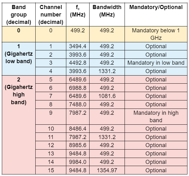 The United States Federal Communications Commission (FCC) and the International Telecommunication Union Radiocommunication Sector (ITU-R) define UWB as a communications technology that transmits and receives a signal whose bandwidth exceeds the lesser of 500 MHz or 20% of the arithmetic center frequency fc. The UWB physical (PHY) layer includes 16 channels in three groupings, as shown in Table 2. The sub-gigahertz band (group 0, shaded yellow) includes one channel at an fc of 499.2 MHz, the gigahertz low band (group 1, shaded blue) includes four channels with fc ranging from approximately 3.5 GHz to 4.5 GHz, and the gigahertz high band (group 2, shaded red) includes 11 channels with fc extending from approximately 6.5 GHz to 10 GHz.