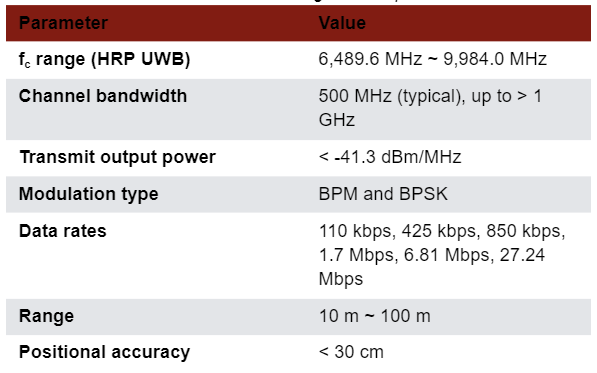 Most UWB products currently on the market focus on the high band, particularly channels 5 and 9. The UWB PHY layer also comes in low-rate-pulse (LRP) and high-rate-pulse (HRP) repetition-frequency configurations. HRP high-band configurations are becoming the preferred configurations, finding success in industrial applications for location and ranging and for device-to-device communications. Table 3 outlines the IEEE 802.15.4z HRP UWB high-band specifications, including a range up to approximately 100 m and data rates from 110 kbps to 27.4 Mbps. In addition, HRP UWB uses two types of modulation: burst position modulation (BPM) and binary phase-shift keying (BPSK).