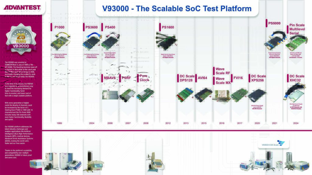 Earlier this year, Advantest celebrated the 25th anniversary of its flagship V93000 system-on-chip (SoC) test platform. The V93000 revolutionized the semiconductor test industry with its single scalable platform approach, enabled by its test processor-per-pin architecture, which has endured over four generations. As a testament to this endurance, the very first V93000 system installed is still in use at the customer site in Italy, alongside several recently purchased fourth-generation V93000 EXA Scale testers.
