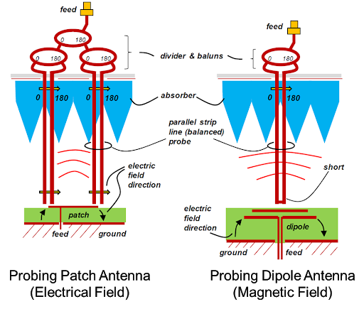 Figure 5. This near-field probing concept for OTA ATE uses two very thin parallel needles to probe the electric or magnetic field on the DUT AiP reactive near field.
