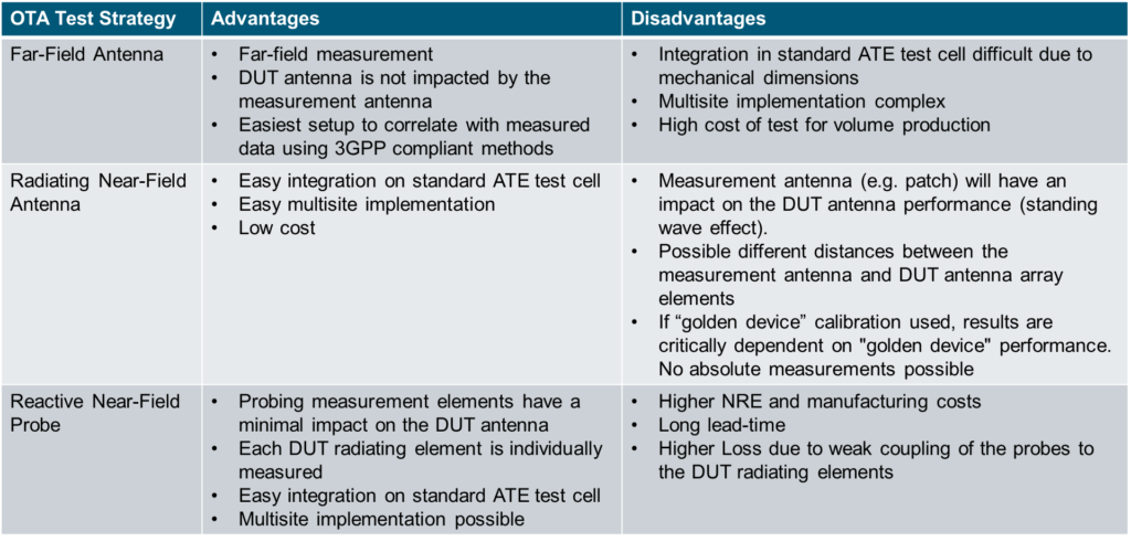 Figure 7. This chart shows the advantages and disadvantages of three OTA test strategies in an ATE environment.