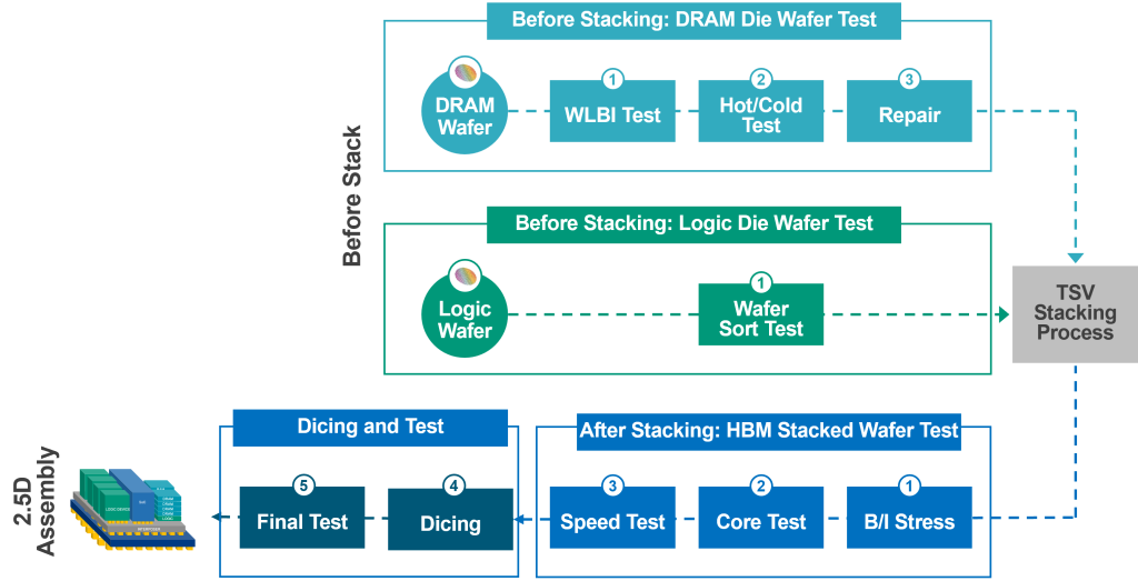 Ensuring the reliability of HBM stacks requires multiple test insertions throughout the production process. Each die within the stack must be validated for performance and integrity before final assembly, as shown in Figure 5. Before stacking, manufacturers perform wafer test that consists of burn-in stress, trimming, failure analysis and repair processes to ensure all memory cells work properly. The logic base die is also tested at wafer-level through SCAN test, IEEE1500 test, and logic test. Additional tests are performed after the DRAM die are stacked on top of the logic base die wafer, including burn-in stress test, DRAM array test, logic die test and high-speed operation test to ensure proper TSV connectivity within the DRAM stack. Advantest has been collaborating with DRAM vendors to develop HBM tests since before volume production began. As a result, the company now supports all test processes essential for the mass production of AI devices.